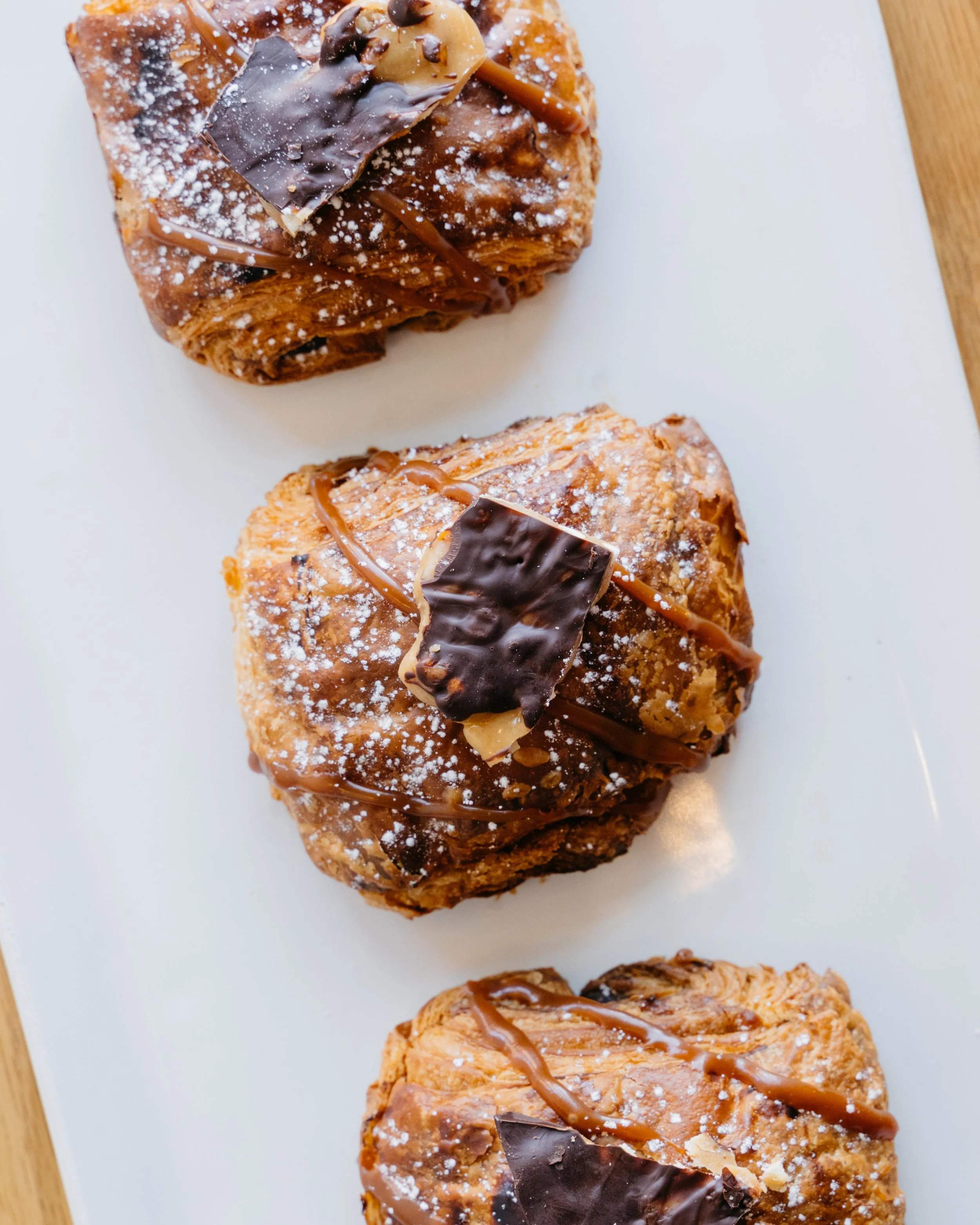 Our chocolate croissant filled with pretzel pastry cream in the center then baked again before finishing with a caramel drizzle and pretzel toffee. Contains wheat, dairy, eggs & soy.